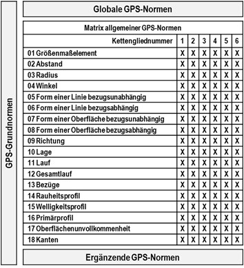 - Sie gilt für alle Kategorien geometrischer Merkmale (Zeilen) und für alle Kettenglieder (Spalten) in der ISO-GPS-Matrix und somit für alle Personen in allen Fachbereichen, die mit der Spezifikation oder Verifikation von Bauteilen zu tun haben.